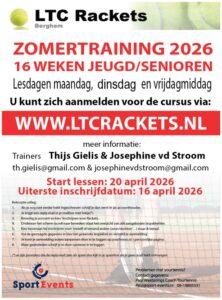 Schrijf je nu in voor de zomertraining 2026 bij LTC Rackets in Berghem en geniet van 16 weken tennisplezier! Onder begeleiding van trainers Thijs Gielis en Josephine van der Stroom starten de lessen op maandag 20 april, met lesmogelijkheden op maandag, dinsdag en vrijdagmiddag voor zowel jeugd als senioren. www.ltcrackets.nl